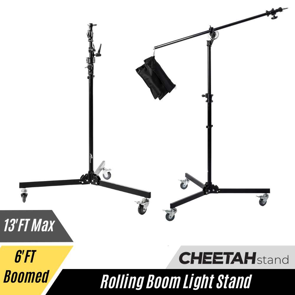 The Cheetah Stand Rolling Boom light stand is the convenient 2 in 1 light stand that combines the features of a C-Stand on locking wheels with built-in boom, ensuring full mobility in any situation. Our Rolling Boom will extend to 13 feet and can support 15 lbs. In Boom configuration, the maximum height will be 6ft while the boom arm can extend outwards 7ft with a max weight of 6lbs. Our flat-spotted spigots will ensure that your light stays exactly where you want it pointed.