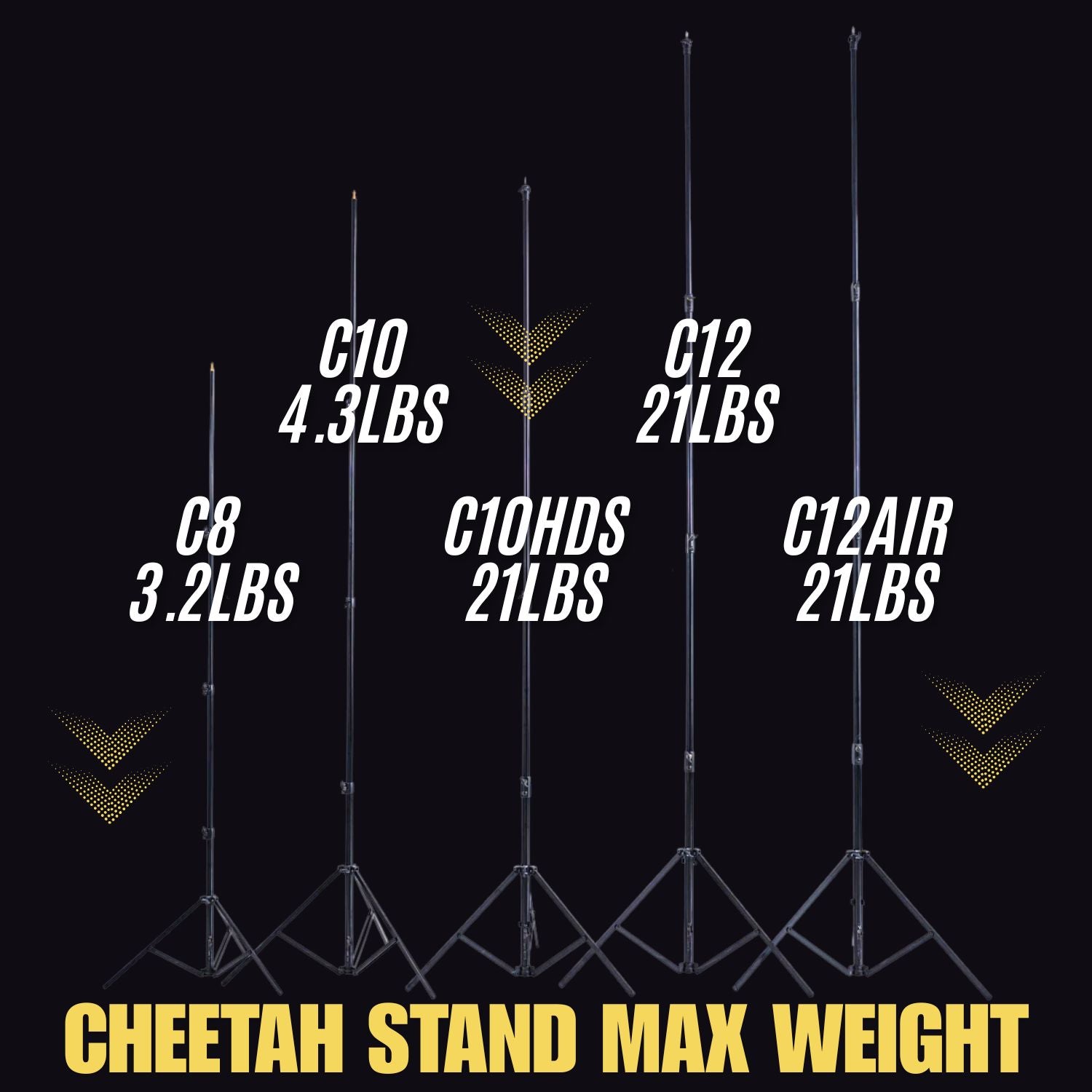 The original Cheetah Stand C8 Auto 8ft Light Stand with innovative auto deploying legs feature help you swiftly move your lighting from one spot to another just by picking up the C8 and setting it back down. The legs fold up automatically and deploy automatically once you set them back down. You'll never go back to traditional light stands, accidentally knocking over vases and bruising your shins. With 8ft in maximum height and 6lbs weight limit, it's the ultimate fast-acting light stand. Maintenance parts are also available to keep your Cheetah Stands fresh.