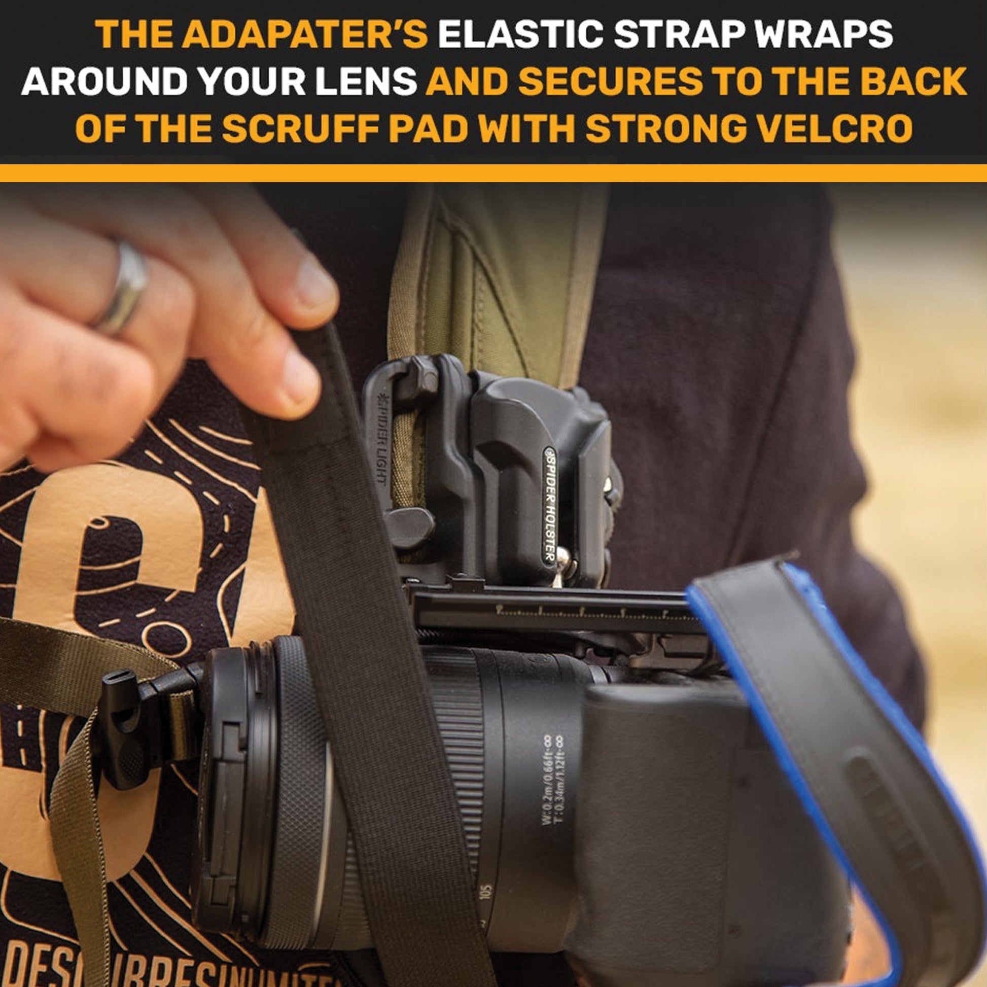 The Backpack Adapter fastens to your backpack's strap, or the front of the Adapter can be looped through any casual belt. The camera pad on the Backpack Adapter has an elastic velcro strap, this is used to secure the camera lens when not in use, preventing excessive camera bounce while also protecting against scuffing.